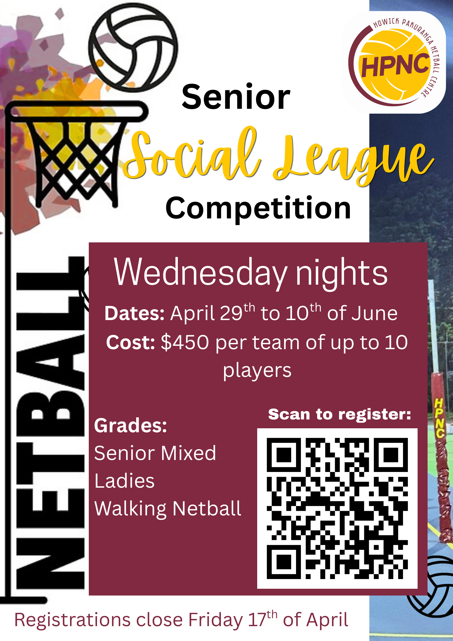 Our Senior Social League is an 8-week social competition held on Wednesday evenings, starting 22nd April. This league is designed to be fun, inclusive, and suitable for all skill levels. Whether you’re returning to netball, playing for fitness, or just keen for a midweek game with friends.